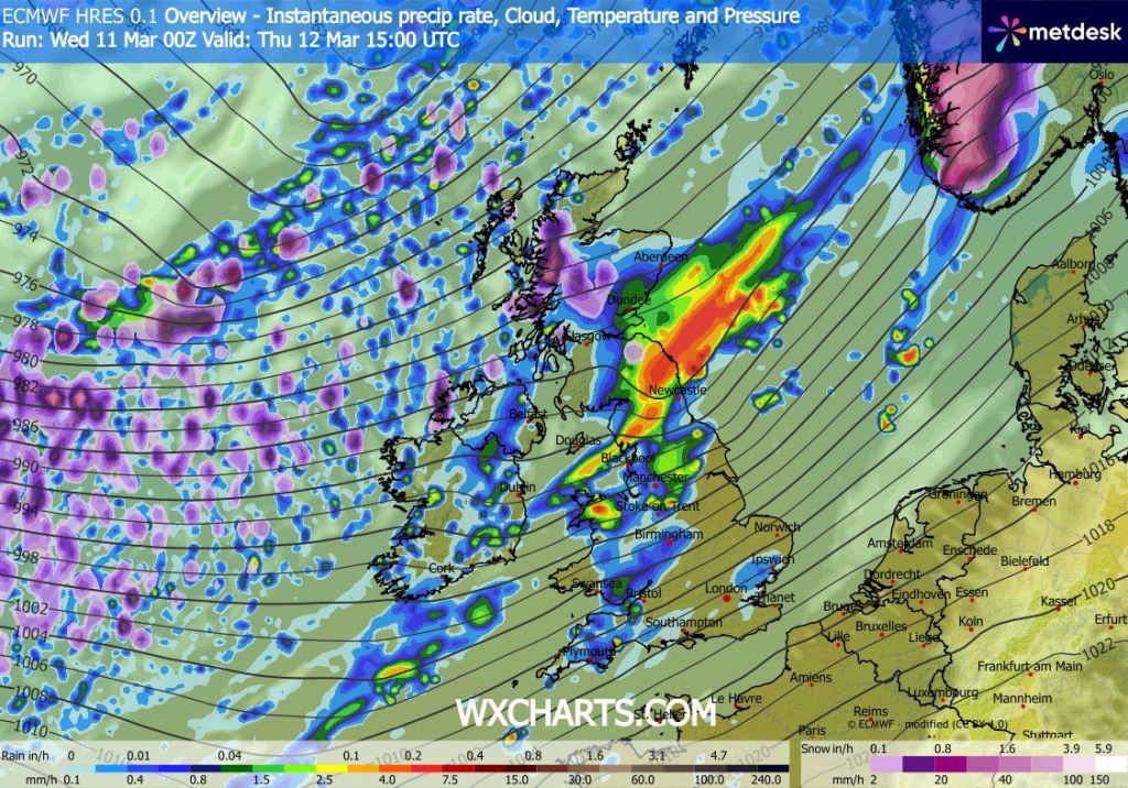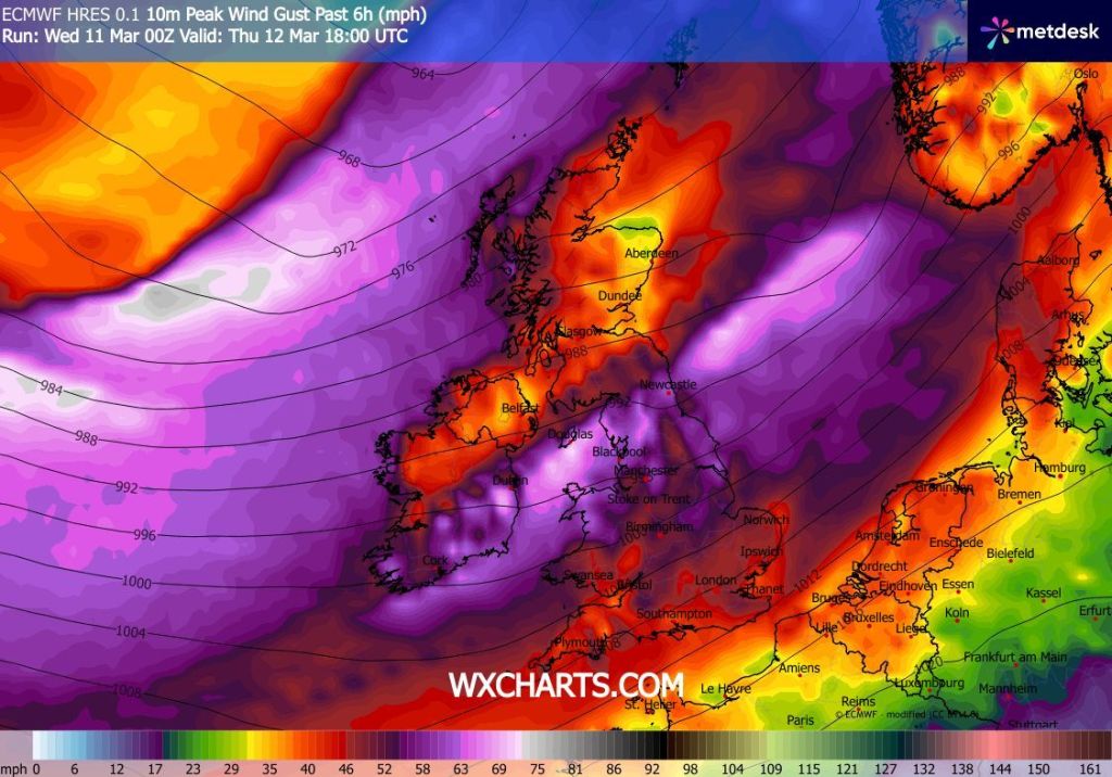 Thursday: It’ll be a cloudy morning after any early brightness fades. Some patchy rain will develop but all eyes will be on a squall-line moving southeast. This will bring an intense band of rain and strong winds (warning in place) for a short period into the evening, followed by further heavy rain and then clearer and much colder conditions. Max 11°C Min 2°C Max Gusts 50mph