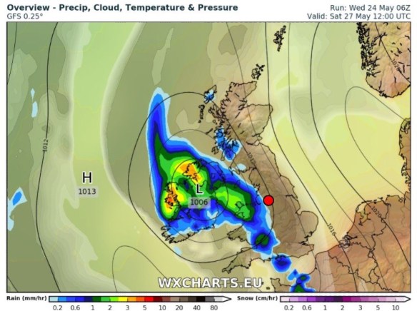 Friday: A muggy day. Cloud will thicken and rain, perhaps heavy and thundery, will arrive from the west. After a humid start it will slowly become fresher. Max 17°C