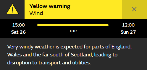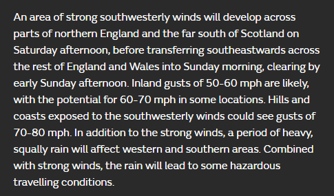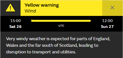 Boxing Day (Saturday) – Back to what we are used to. More mobile weather now as bands of showery rain move south-east with winds increasing quickly. Heavy rain for a time during the evening. Currently we have a weather warning in place (see below) with gusts expected to exceed 50mph quite widely later in the evening and overnight. Milder. Max 8°C