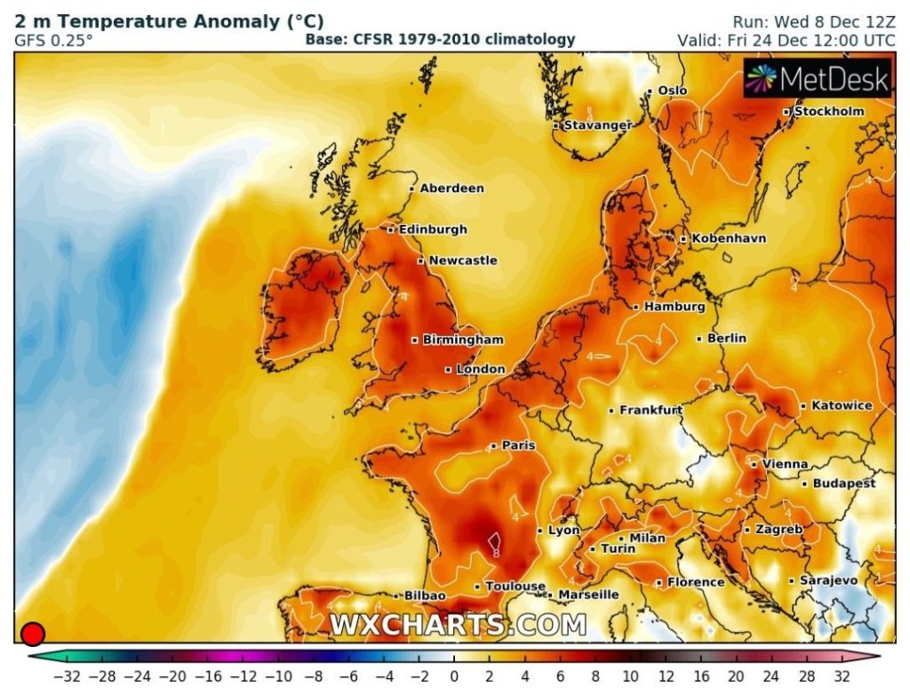 Christmas Eve: Remaining mild for the time of year and again generally cloudy. Some rain arriving later in the day and overnight. Winds increasing. Max 8°C