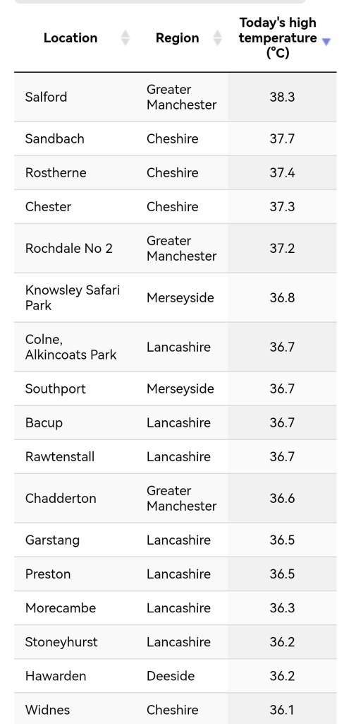 NW England Maximum Temperatures (unofficial sites) on Tuesday 19th July 2022