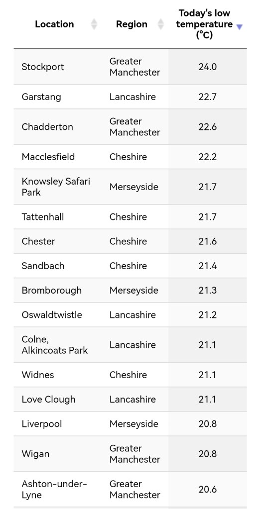 NW England Highest Minimum Temperatures (unofficial sites) on Tuesday 19th July 2022