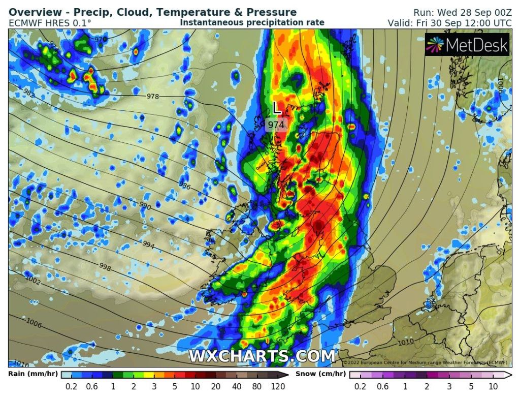 Friday: A large area of low pressure will anchor to the northwest of the UK and dominate the weather. Cloud thickening quickly, and any brightness fading as heavy rain sweeps in from the west during the morning. Winds increasing later to gust locally to 40mph. The rain will turn showery into the evening. Max 14°C