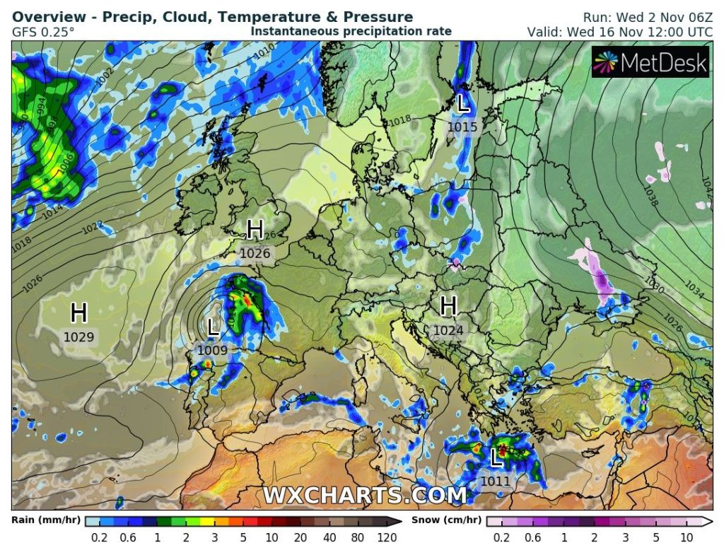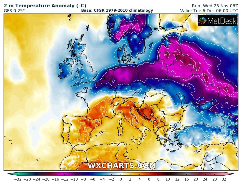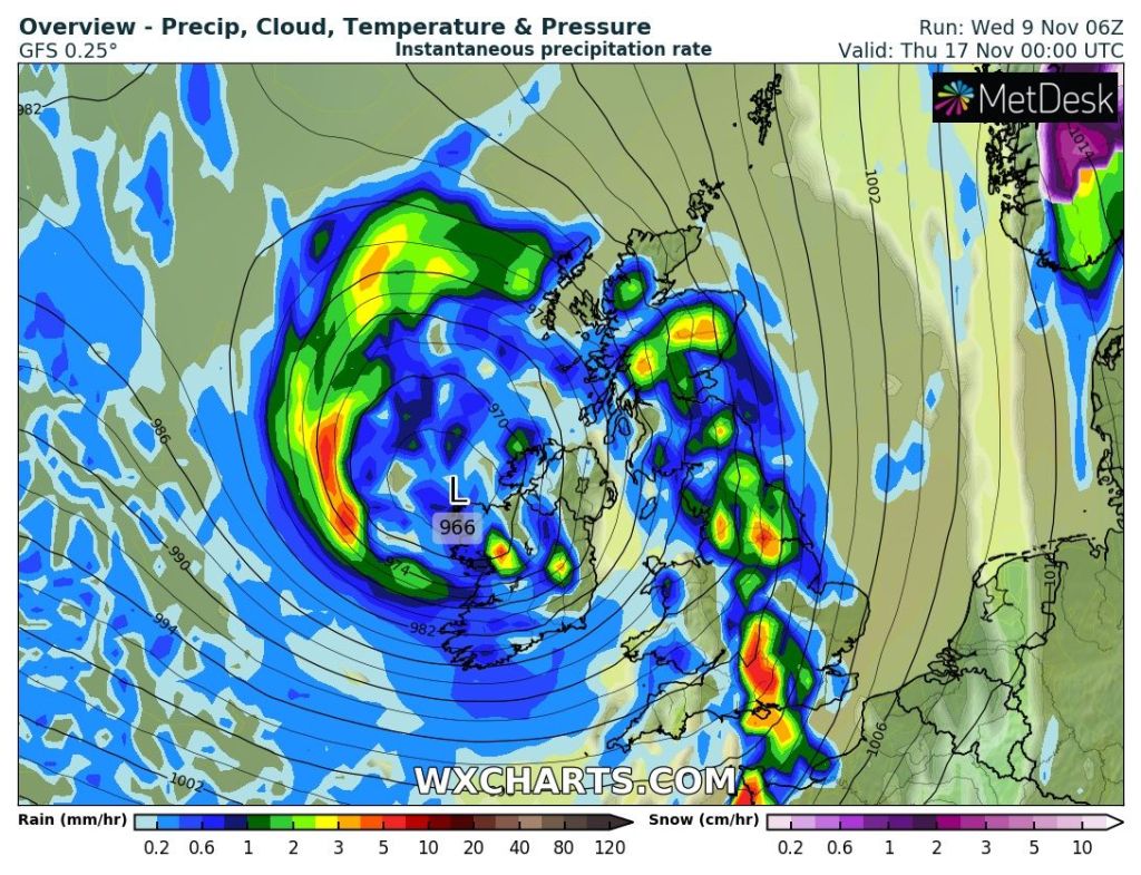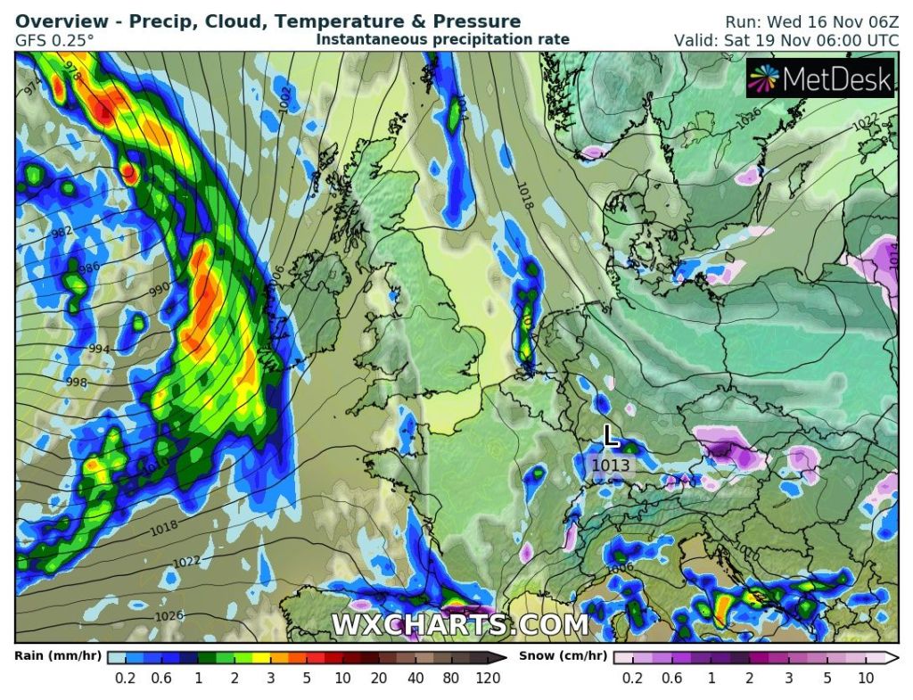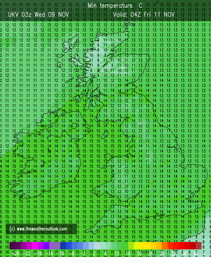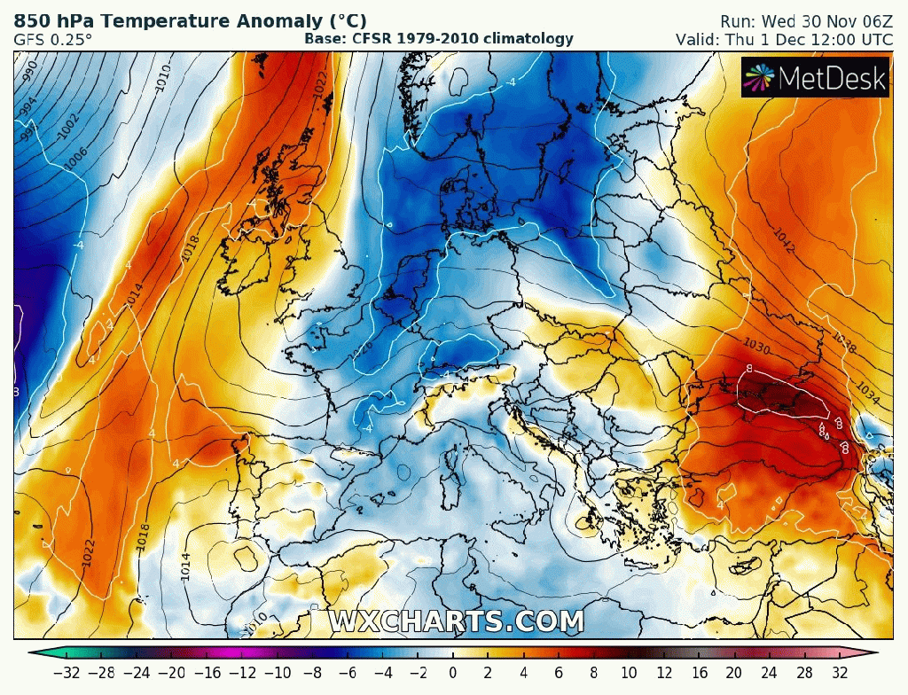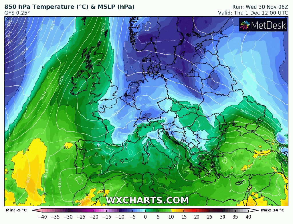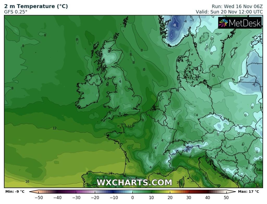 Outlook: Very little change for the next couple of days but after that does look interesting as there’s the potential for high pressure to build towards Greenland and low pressure over Scandinavia which will allow for a cold northerly airflow to develop, straight from the Arctic. Nothing extremely cold but cold enough for a few snow showers, even to lower-levels. Temperatures look set to remain below-average with the risk of wintry showers increasing. The second week of December could see a battlefield developing. Will milder air push in from the south-west or could it turn much colder from the east; not exactly what we need with energy prices! Watch this space.