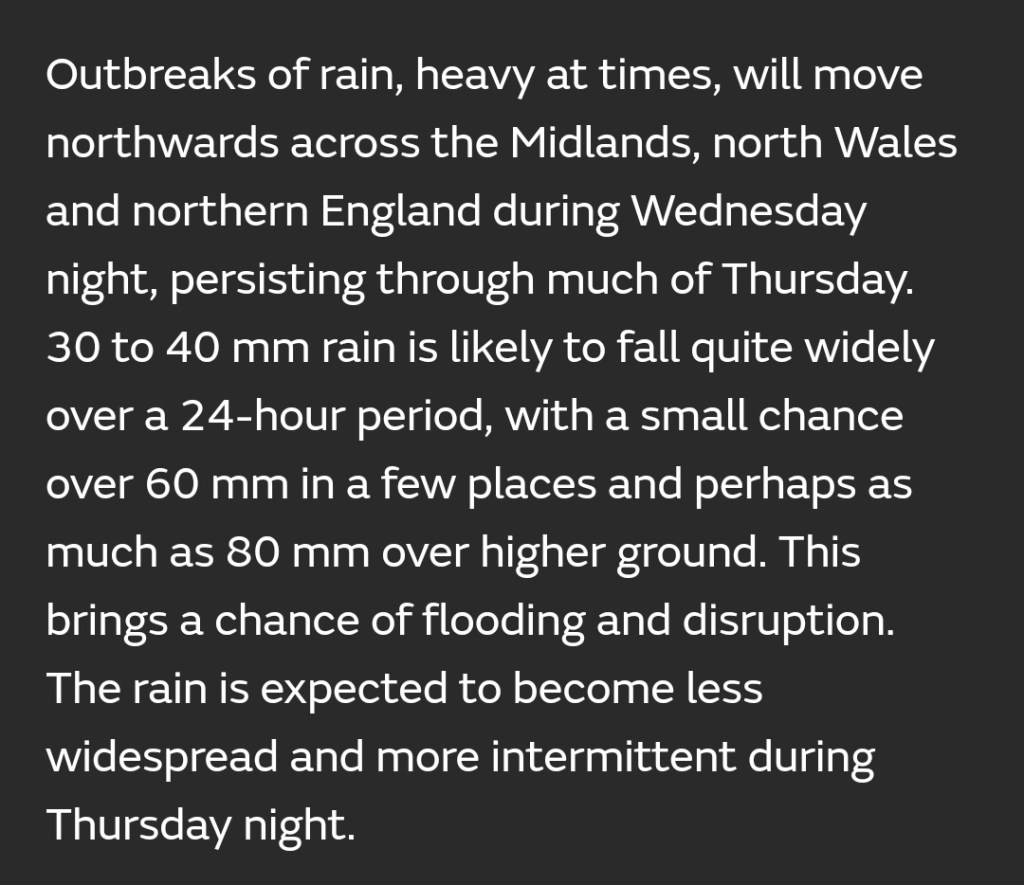 Sunday: Overcast with a keen wind and cold with a feels-like temperature of 0°C. Can’t rule out an isolated shower which would be wintry on the tops of the Pennines. Max 5°C