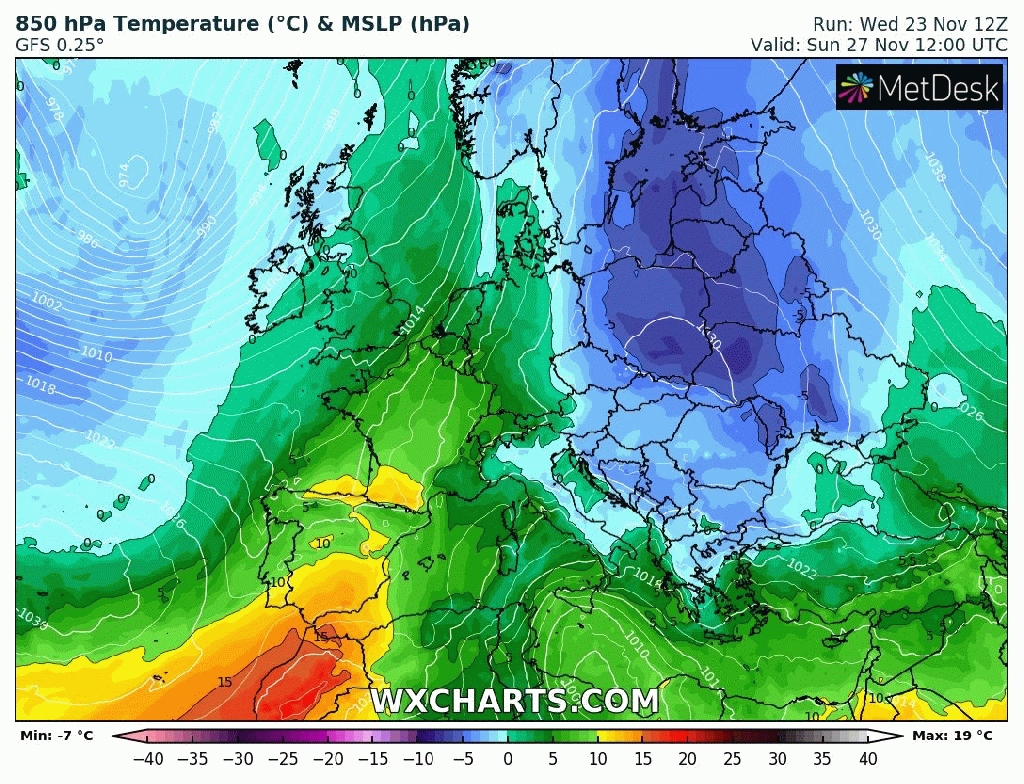 Winter, meteorologically-speaking is here. We ended Autumn as we start Winter, with below-average temperatures and with the weather set in a pattern. A huge high pressure across eastern Europe, originally building over Scandinavia is controlling our weather. When this happens, we can drag in cloud off the still relatively warm North Sea and hence have days on end of little change. The doom and gloom can come in the form of fog/low-cloud especially with little wind and with any brightness to the west or even as far west as the coast. We are currently in this predicament but slight changes are on the way.
