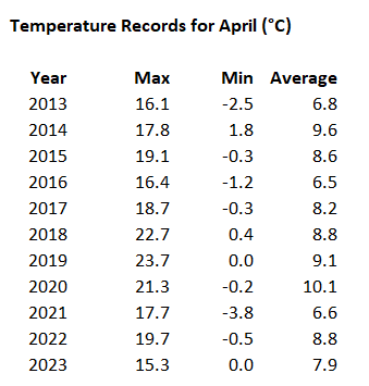 It’s not been the best April when it comes to warmth with temperatures below-average. It’s the 4th coolest April looking back through the last 11 years of my data. We haven’t risen above 15°C yet.