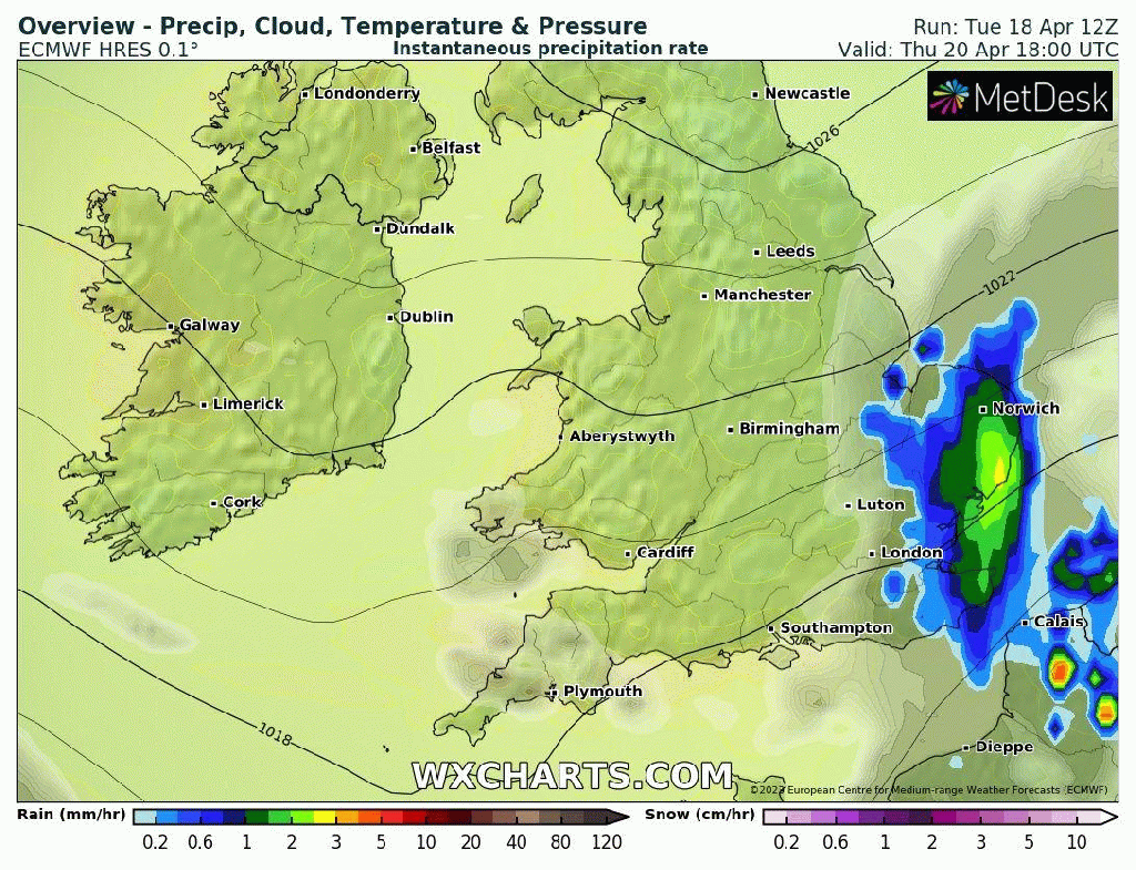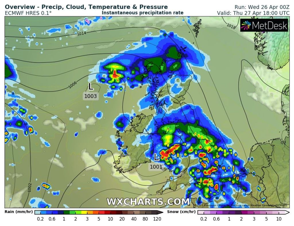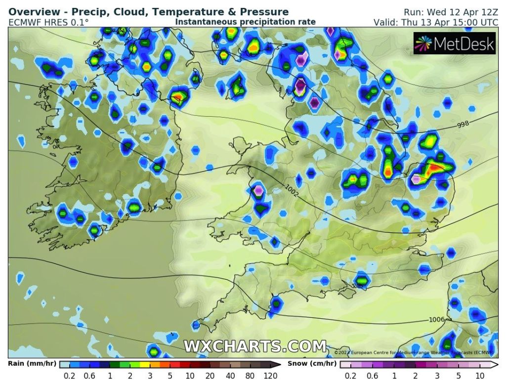 Thursday: A fresh start in places with sunny spells. Cloud thickening into the afternoon with rain eventually arriving into the evening, with some heavy bursts. Temperatures up a notch on recent days. Max 13°C