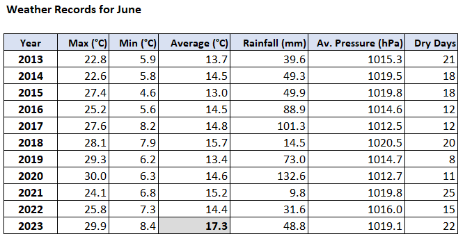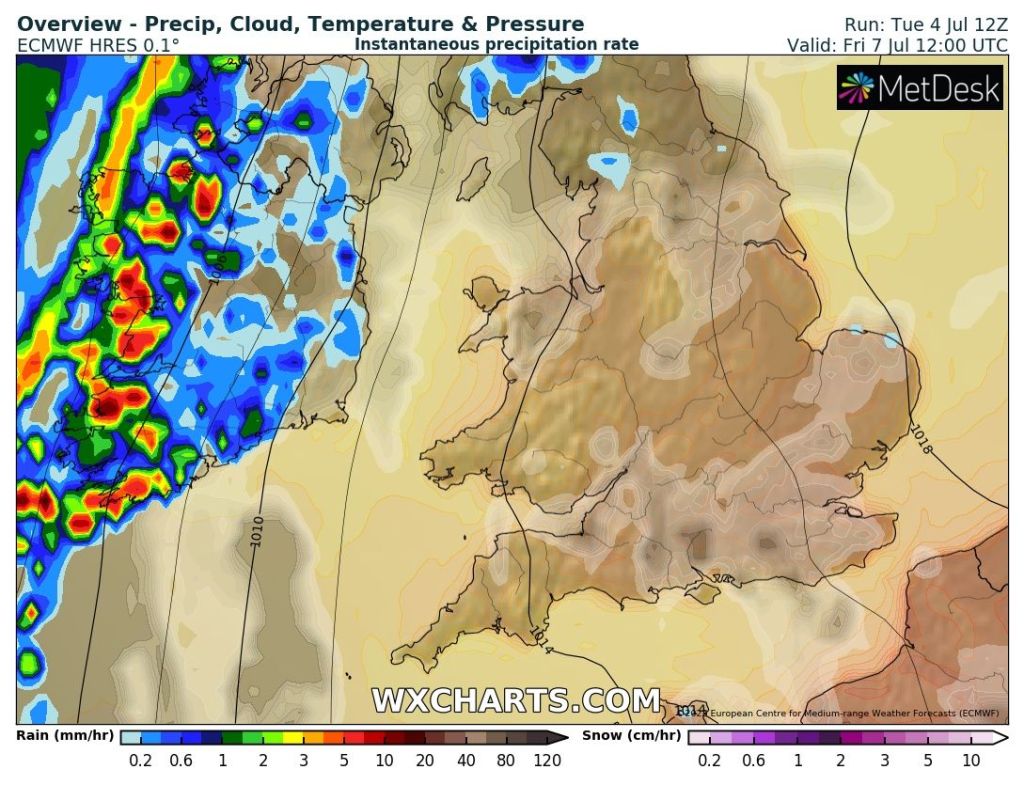 Friday: Low pressure approaching. Mostly cloudy with a few scattered showers into the afternoon but most could stay dry. Quite muggy. A warm night. Max 20°C Min 15°C