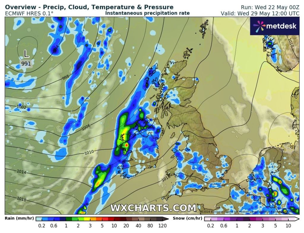 Outlook: Low pressure to take control of the weather then possibly drift away to the North Sea. Unfortunately, high pressure that was looking like it might build across the country, will only build out into the Atlantic, meaning we will be in a showery airflow with west to north-westerly winds and temperatures remaining around the same. So, in any drier spells with sunshine, pleasant enough but equally some showers.