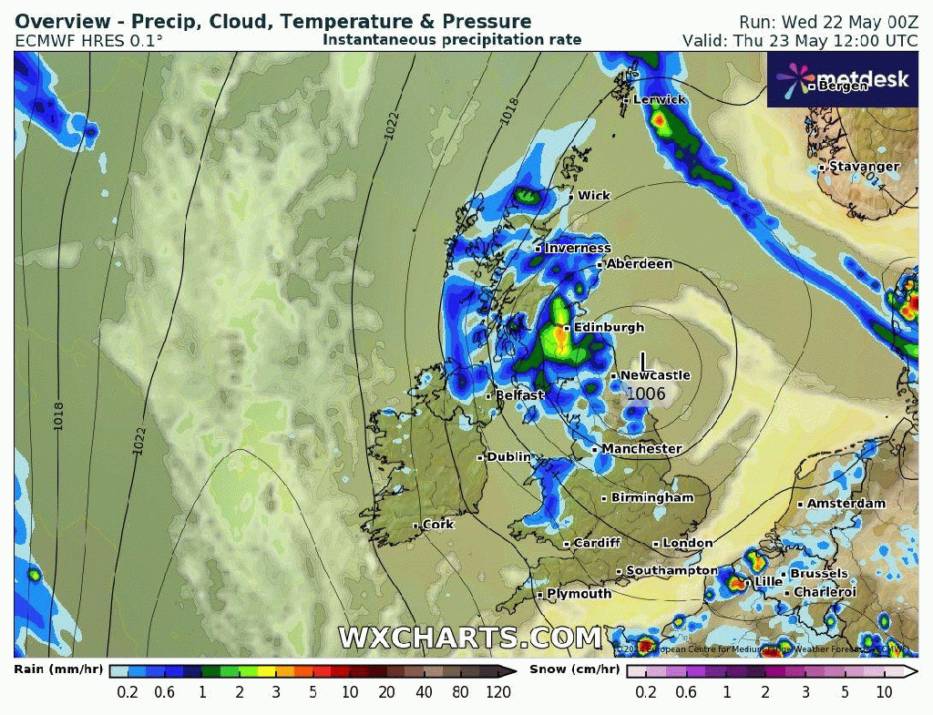 Bank Holiday Monday: Some uncertainty this far out, but it looks like low pressure will begin to develop across the UK, albeit quite slack. This means relatively light winds and apart from the odd bright spell, we’re expected to grow some beefy slow-moving showers into the afternoon which could be thundery. Max 17°C Min 9°C