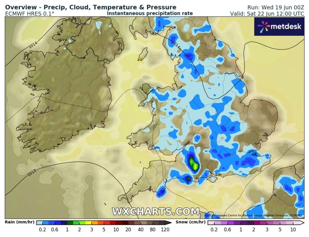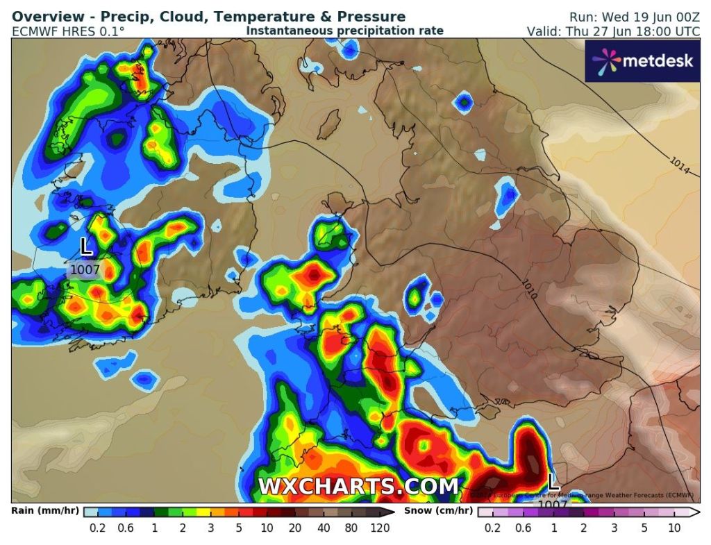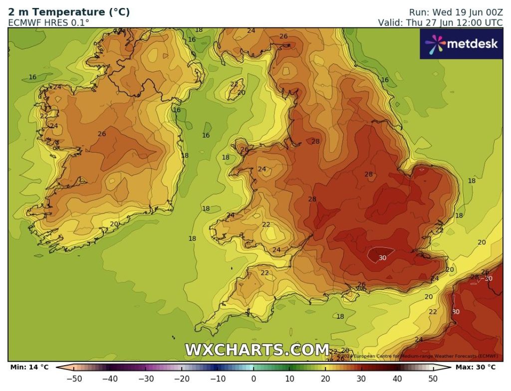 Currently June has only had 50% of its expected monthly rainfall. Some areas down in the southeast of England are sitting at only 10%. Currently it’s a 50/50 split with 13 days dry and 13 days with measurable rainfall.