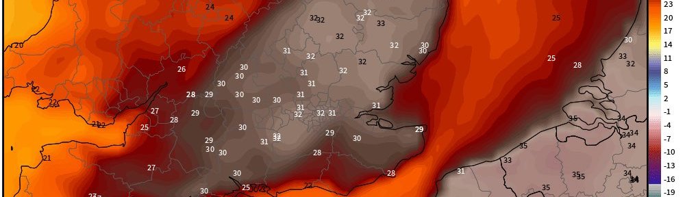 Sunday: A plume of hot air will move up from the south. That said the first half of the day is expected to see a lot of cloud with very warm-to-hot temperatures developing into the afternoon as cloud breaks and sunny spells arrive. Muggy especially later and overnight. Max 25-27°C Min 16°C