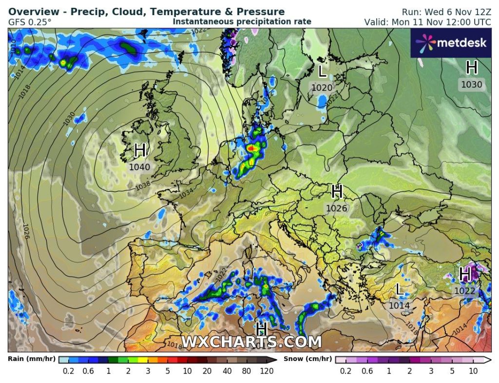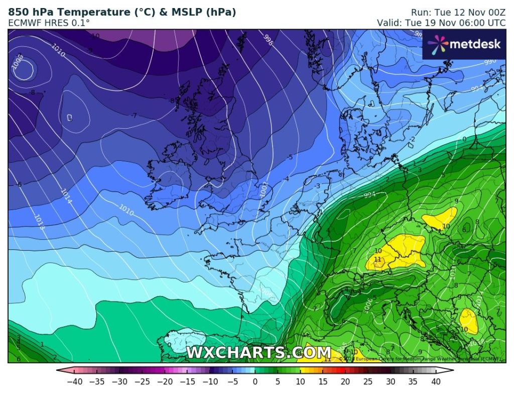 Thursday: A cold and frosty start with some patchy fog and ice. A decent but cold day with plenty of late-autumn sunshine on offer. Clear spells continue overnight but the wind will increase and this will help to drag in milder air from the southwest, so no frost overnight. If anything temperatures will rise during the night albeit slowly. Max 6°C Min 5°C