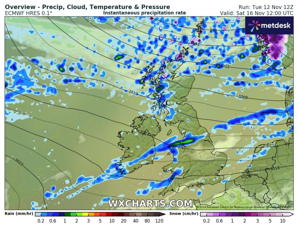 Sunday: Those rain-bearing fronts out west are likely to slip in across the region bringing periods of rain which will become showery in nature as a ridge of high pressure builds from the west, decaying the rain-band. Still mild but a cooler night. Max 13°C Min 6°C