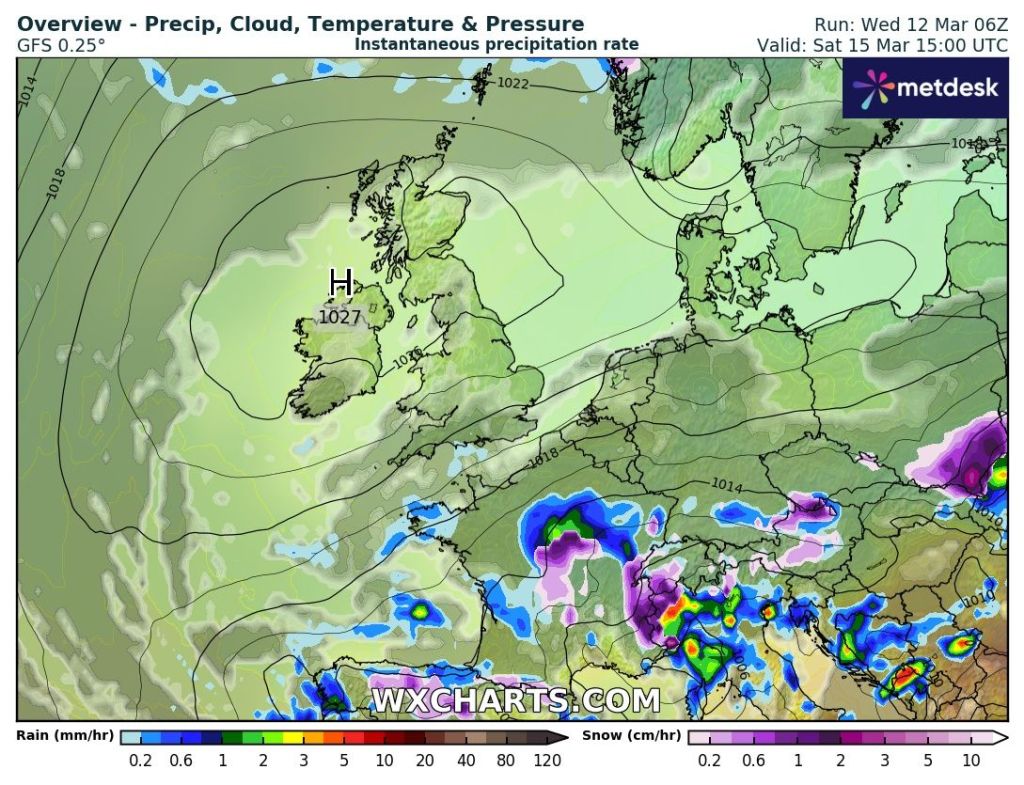 Sunday: It’s looking better for Mother’s Day albeit breezy. Dry, as high pressure builds back in and some pleasant sunny spells. Just the wind taking the edge off the temperature but it will be warmer. Max 16°C Min 5°C Gusts 20mph