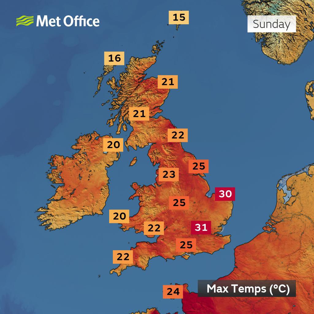 Sunday: Some stubborn cloud to clear and very warm to hot with sunny spells developing. Not as windy as recently. Max 25°C Min 16°C