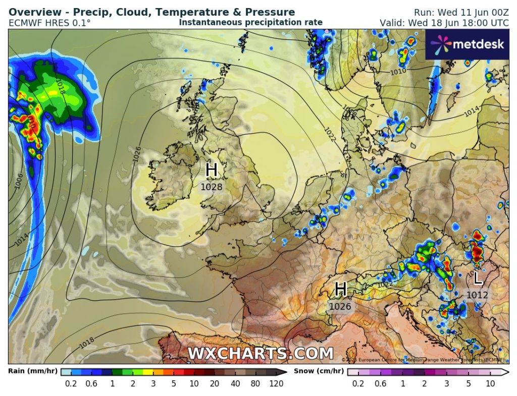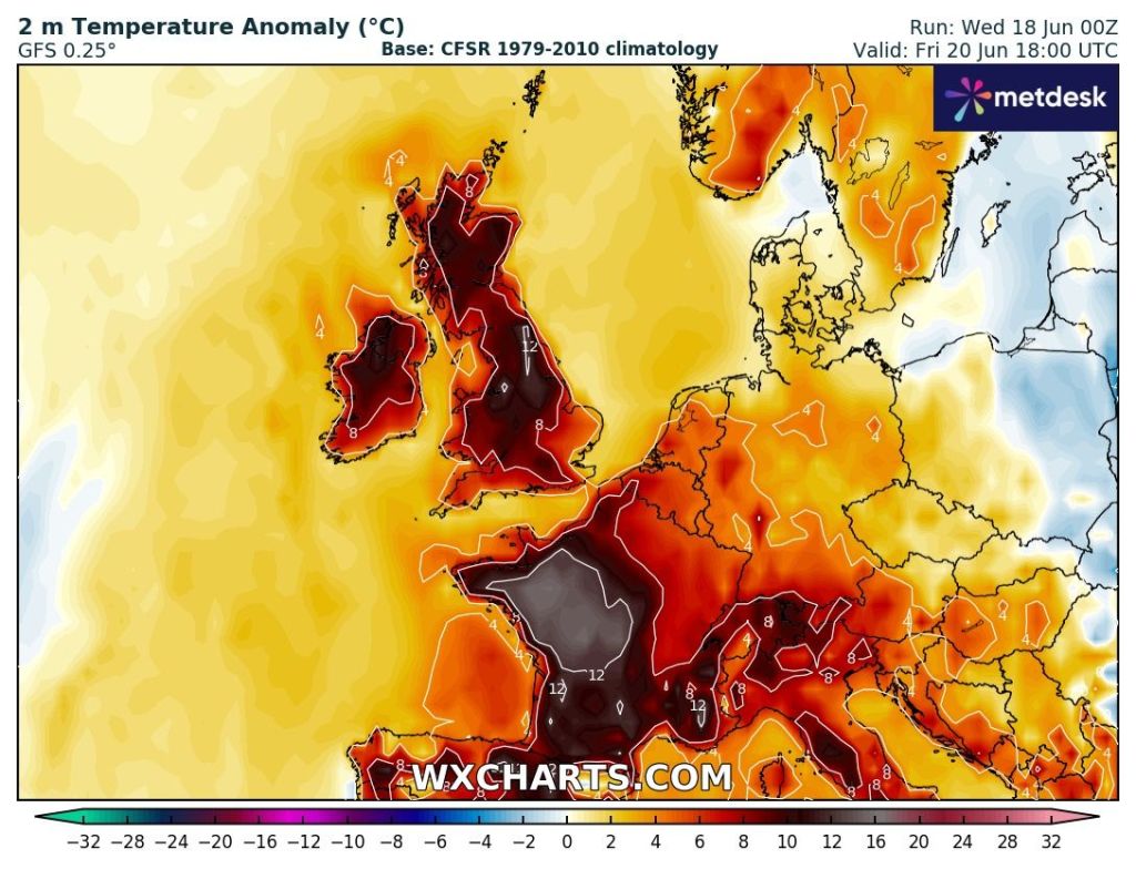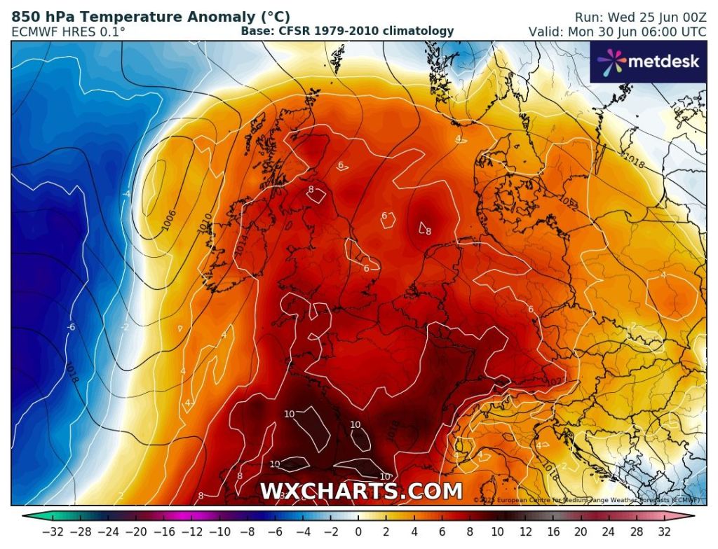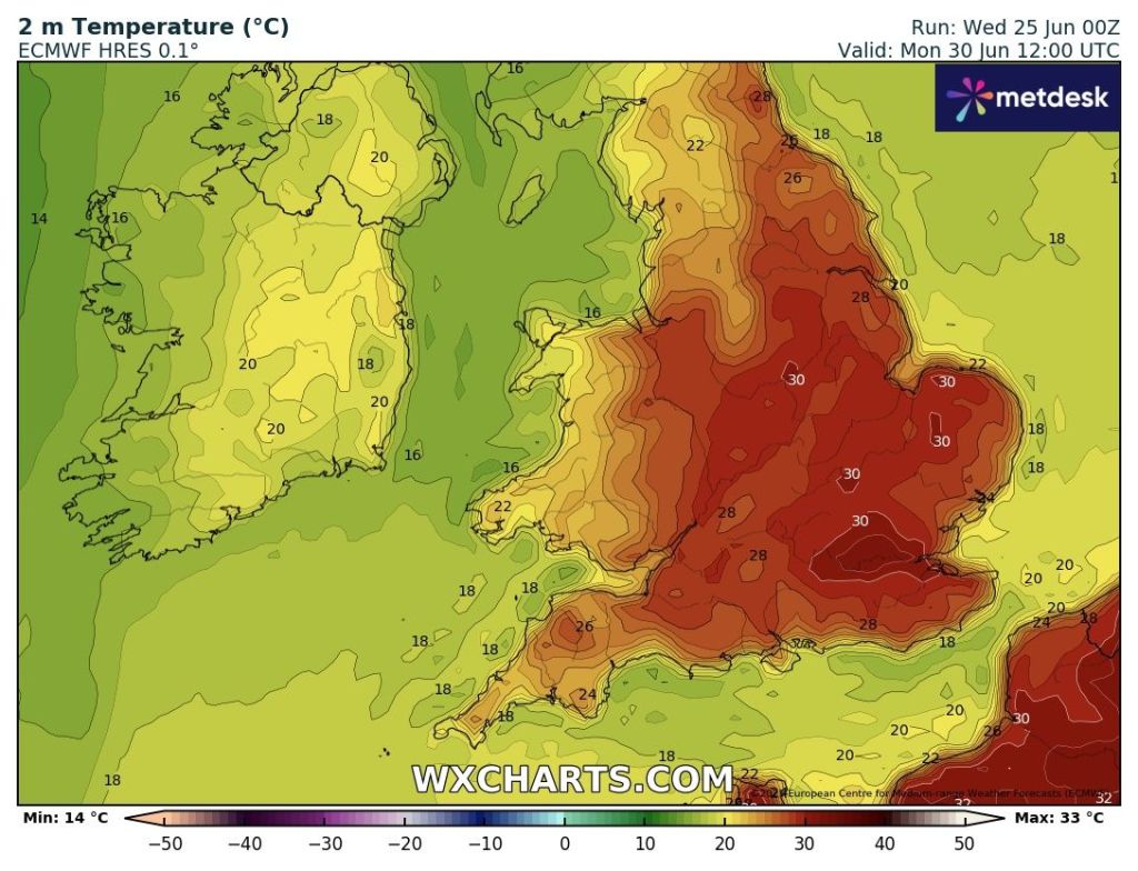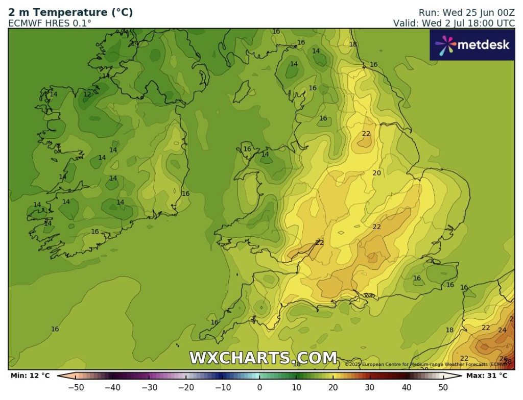 Outlook: Monday will be another hot one with plenty of sunny spells. Fresher air will arrive on Tuesday with a few showers blown in on a northwesterly wind. After that becomes a little bit more uncertain, but a ridge of high pressure nudging up from the Azores is currently the favourable outcome. So we do see some hot weather as we enter next week but it will be short-lived and shouldn’t reach the heatwave threshold.
